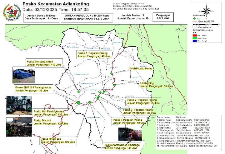 Di Kecamatan Adiankoting, dua desa menjadi pusat lokasi pengungsian, yaitu Desa Sibalanga dan Lobu Pining. Sementara itu, lima desa lainnya masih belum dapat diakses karena tertutup longsor dan kondisi medan ekstrem, yakni Siantar Naipospos, Pardomuan Nauli, Pagaran Lambung II, Pagar Lambung IV, dan Pagar Lambung III. Untuk sementara waktu, bantuan bagi wilayah-wilayah tersebut disalurkan melalui jalur udara. Adapun dua desa yang sebelumnya terisolir Banuaij I dan Banuaij IV kini sudah bisa diakses oleh tim darat, termasuk Pagar Lambung I yang juga telah berhasil ditembus.